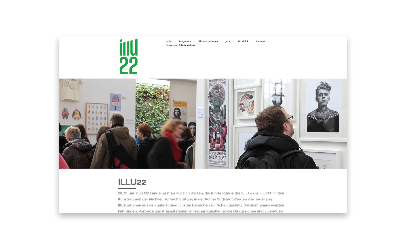 Für die Kulturveranstaltung in 2022 aktualisieren wir die Website der Illustrations-Ausstellung. Bereits 2016 gibt büro ident. dem Festival den Look im Web. Ankündigungen, Besucher*innen-Information, Aussteller*innen-Portal, -Blog und Event-Rückblicke sind die Themen, die die Webseite kommuniziert. Zudem wird sie dem hohen ästhetischen Anspruch der vorgestellten Künstler*innen gerecht und stellt ein Portal zur Verfügung, das ausreichend Platz bietet für die kreative Vielfalt der Illustrator*innen-Szene – natürlich responsive abrufbar und optimiert für alle mobilen Endgeräte. In den Kunsträumen der Michael Horbach Stiftung in der Kölner Südstadt werden vier Tage lang Illustrationen aus den unterschiedlichsten Bereichen ausgestellt. Darüber hinaus werden Führungen, Vorträge und Präsentationen einzelner Künstler*innen, sowie Diskussionen und Live-Musik auf dem Programm stehen.